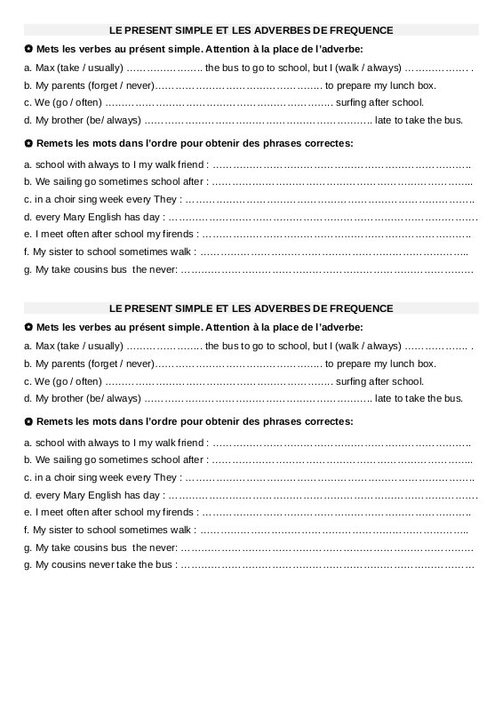 Récris les phrases en plaçant l'adverbe de fréquence au bon endroit. ATTENTION : il faut respecter les majuscules et la ponctuation.